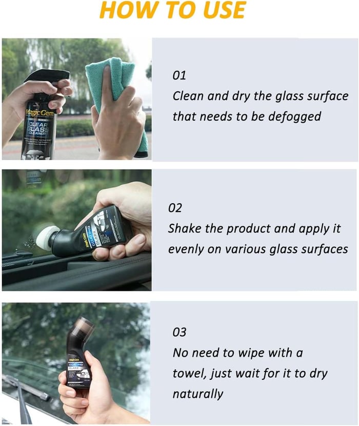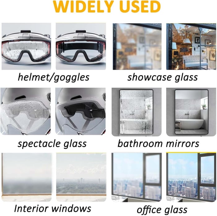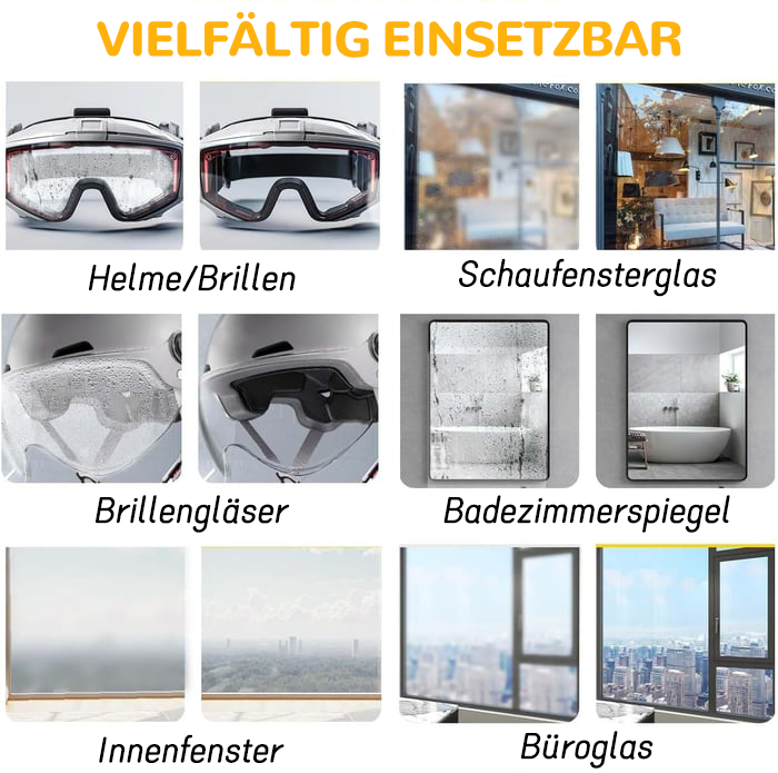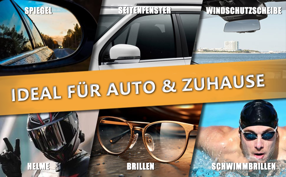 SICHER AUF VIELEN OBERFLÄCHEN: Es ist sicher für die Anwendung auf Autoscheiben, Rückspiegeln, Helmviseieren und anderen Glas- oder Polycarbonat-Oberflächen und bietet nebelfreie Klarheit, ohne empfindliche Materialien zu beschädigen oder zu verkratzen.